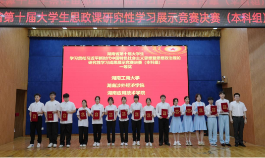 近年来,在参加湖南省大学生思想政治理论课研究性学习成果展示竞赛中我校师生屡获佳绩。成绩的取得离不开学校党委的高度重视以及学校各部门和二级学院的大力支持,更离不开马克思主义学院全体思政课教师的辛勤付出和同学们的认真努力。马克思主义学院将以此次竞赛为契机,积极探索思政课教学方法改革,扎实开展实践教学活动,不断推动思政理论课改革创新,激发广大学生学习积极性,提高思政课的针对性、实效性和吸引力。