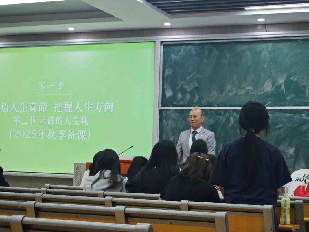 为进一步提升青年教师教学水平,深化思想道德与法治课程教学改革,9月29日下午,德法教研室在第三教学楼204教室成功举办了青年教师教学公开课及听课评课活动。本次公开课由吴旭冉老师主讲,主题为“正确的人生观”,教研室全体教师参与观摩与研讨。