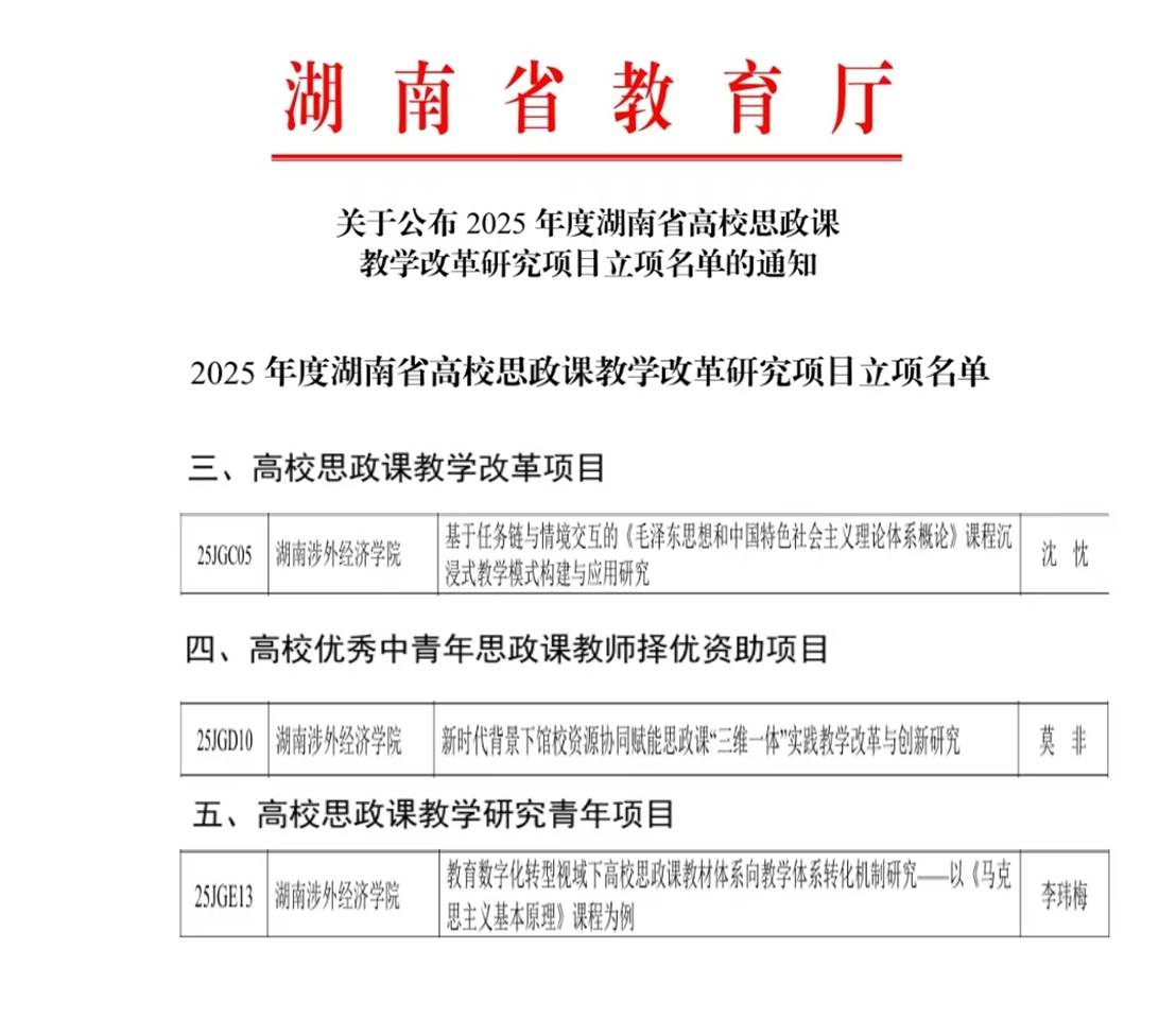 近日,湖南省高校思政课教学改革研究项目立项结果揭晓,我院沈忱、莫非、李玮梅三位教师凭借创新性的研究方案和扎实的教学实践基础成功获批立项!此次立项标志着我院在深化思政课教学改革、探索育人新路径方面再获省级认可。