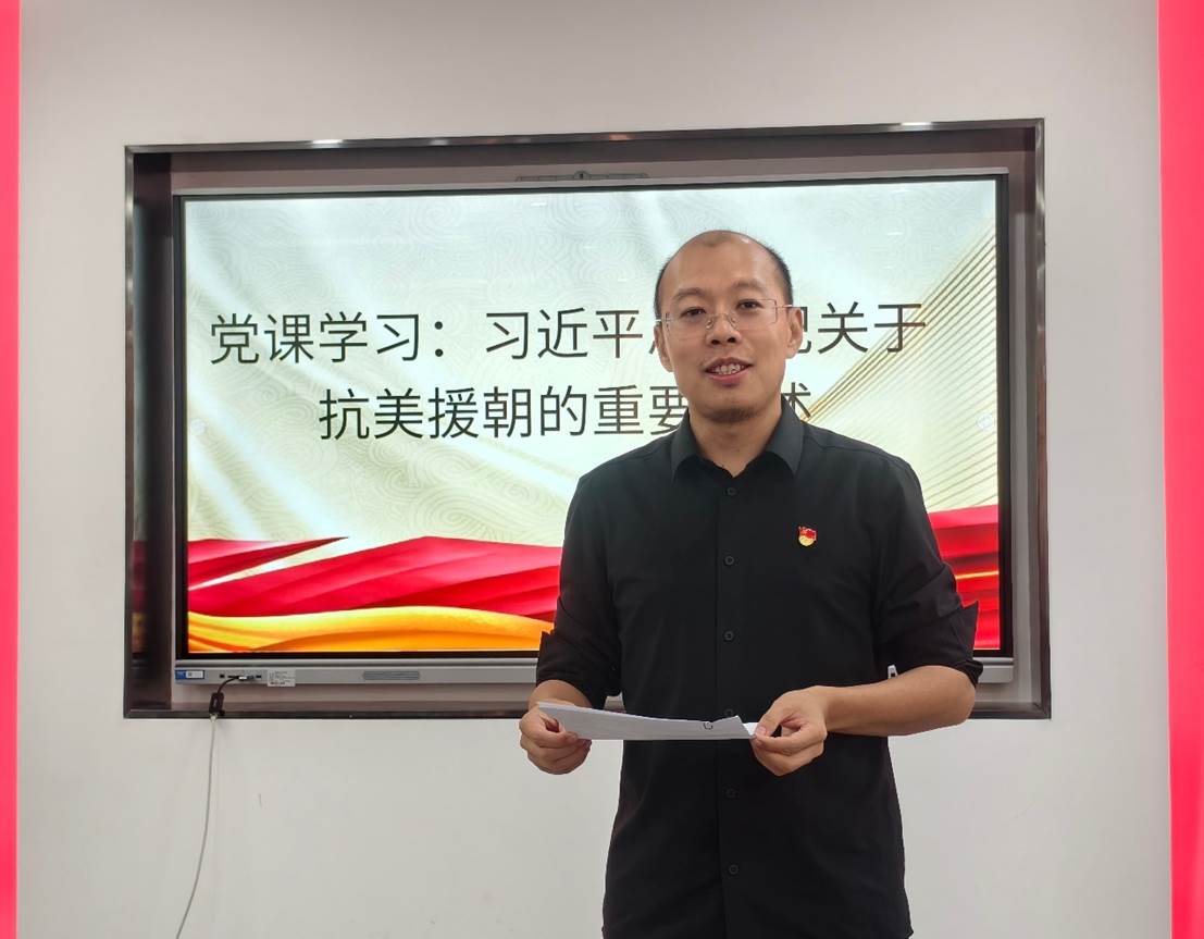 活动伊始,支部宣传委员吴旭冉同志以《以伟大精神照亮前行之路——学习习近平总书记关于抗美援朝重要论述》为题,为全体党员讲授了一堂生动的党课。吴委员从“历史抉择的必然性”“精神丰碑的永恒价值”“新时代使命的实践要求”三个维度出发,结合抗美援朝战争中的经典战例和英雄事迹,深入剖析了抗美援朝精神的历史意义和时代价值。他指出:“抗美援朝战争的胜利,不仅捍卫了国家主权和安全,更打出了中国人民的精气神,铸就了伟大的抗美援朝精神。新时代党员要从中汲取奋斗力量,勇担时代使命。”