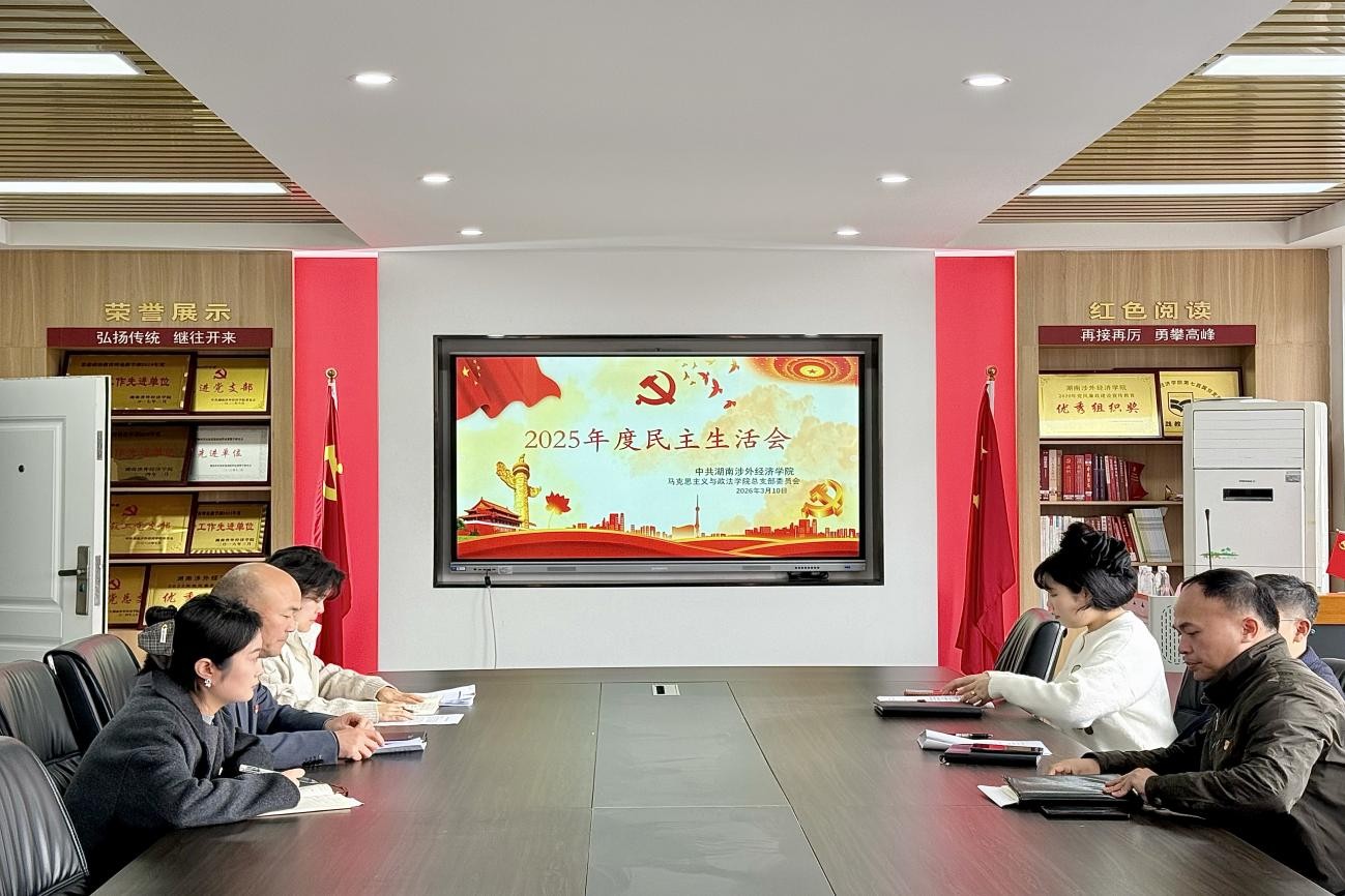 为深入学习贯彻党的二十届四中全会精神,巩固深化中央八项规定精神学习教育成果,锲而不舍推进作风建设常态化长效化,以严实作风锻造坚强班子、夯实育人根基,3月10日14时,湖南涉外经济学院马克思主义与政法学院党总支在第一教学楼202会议室召开2025年度民主生活会。会议由党总支副书记赵晗宇主持,学院总支委成员参加。