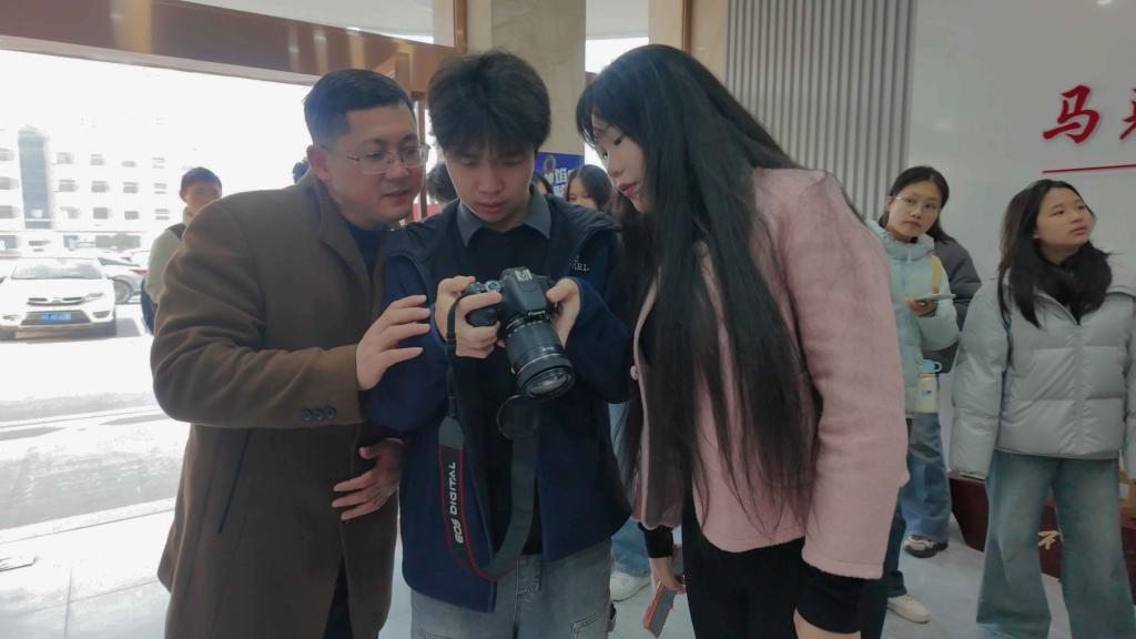 (领导与师生一同查看活动拍摄照片)